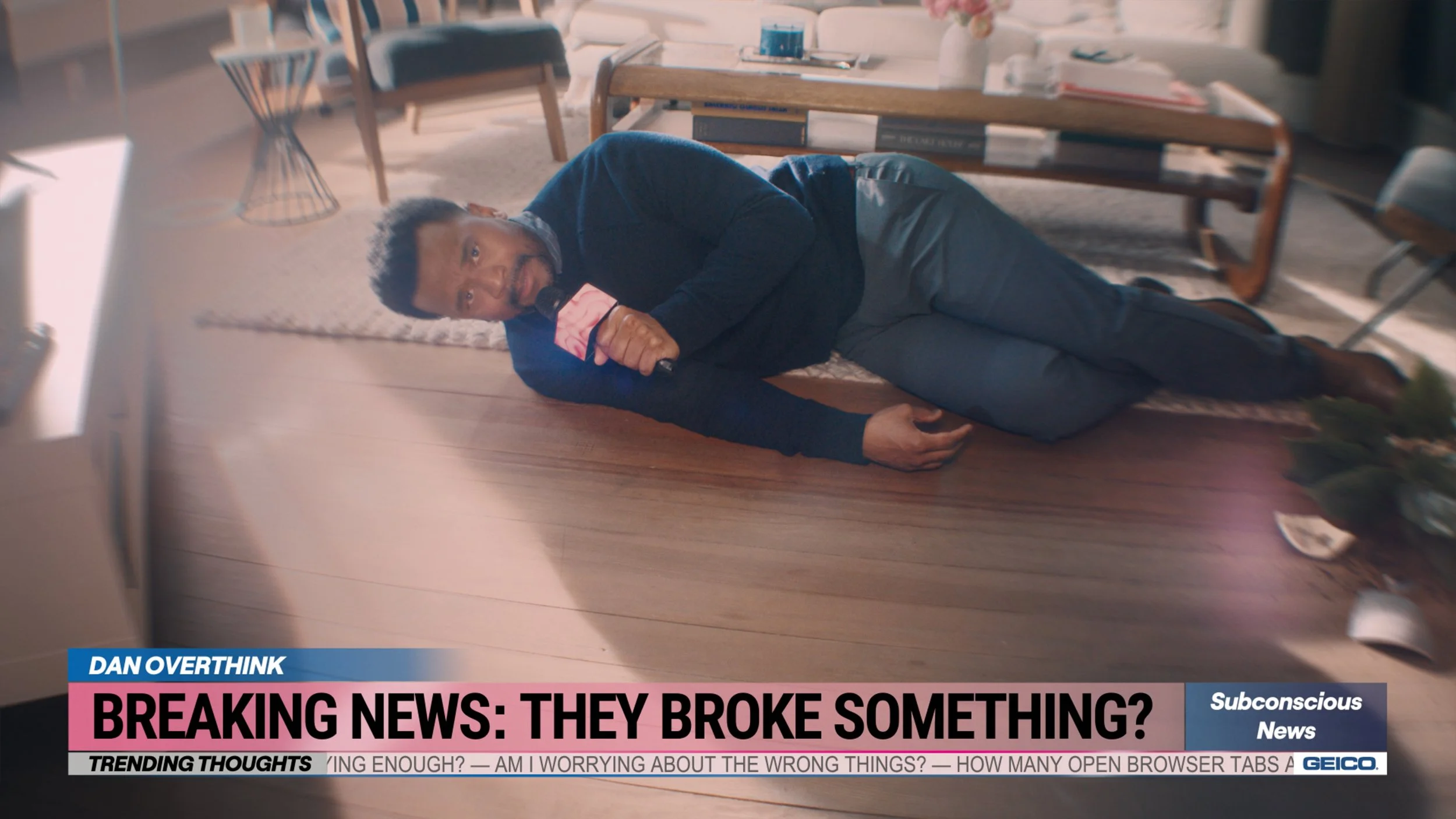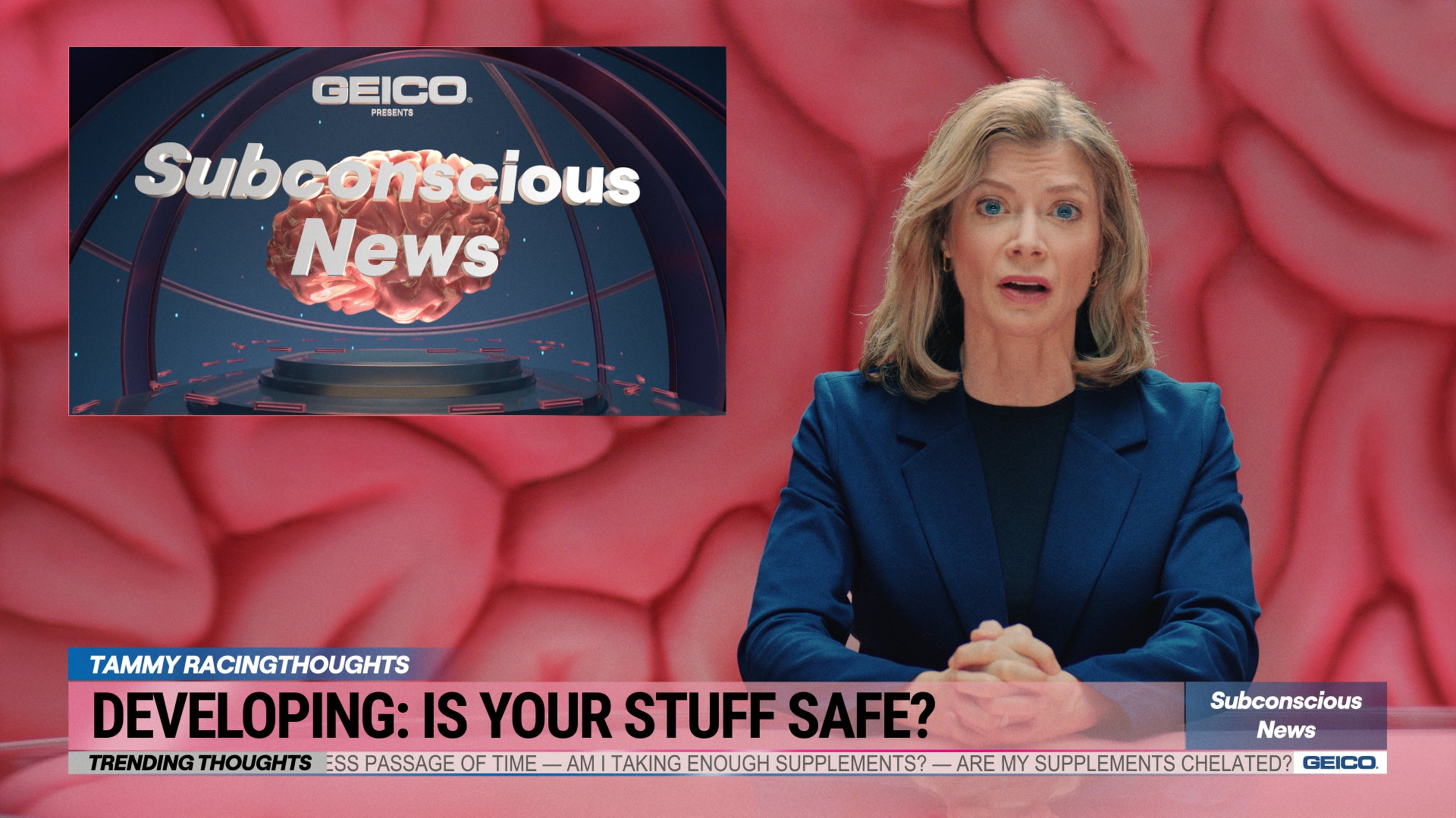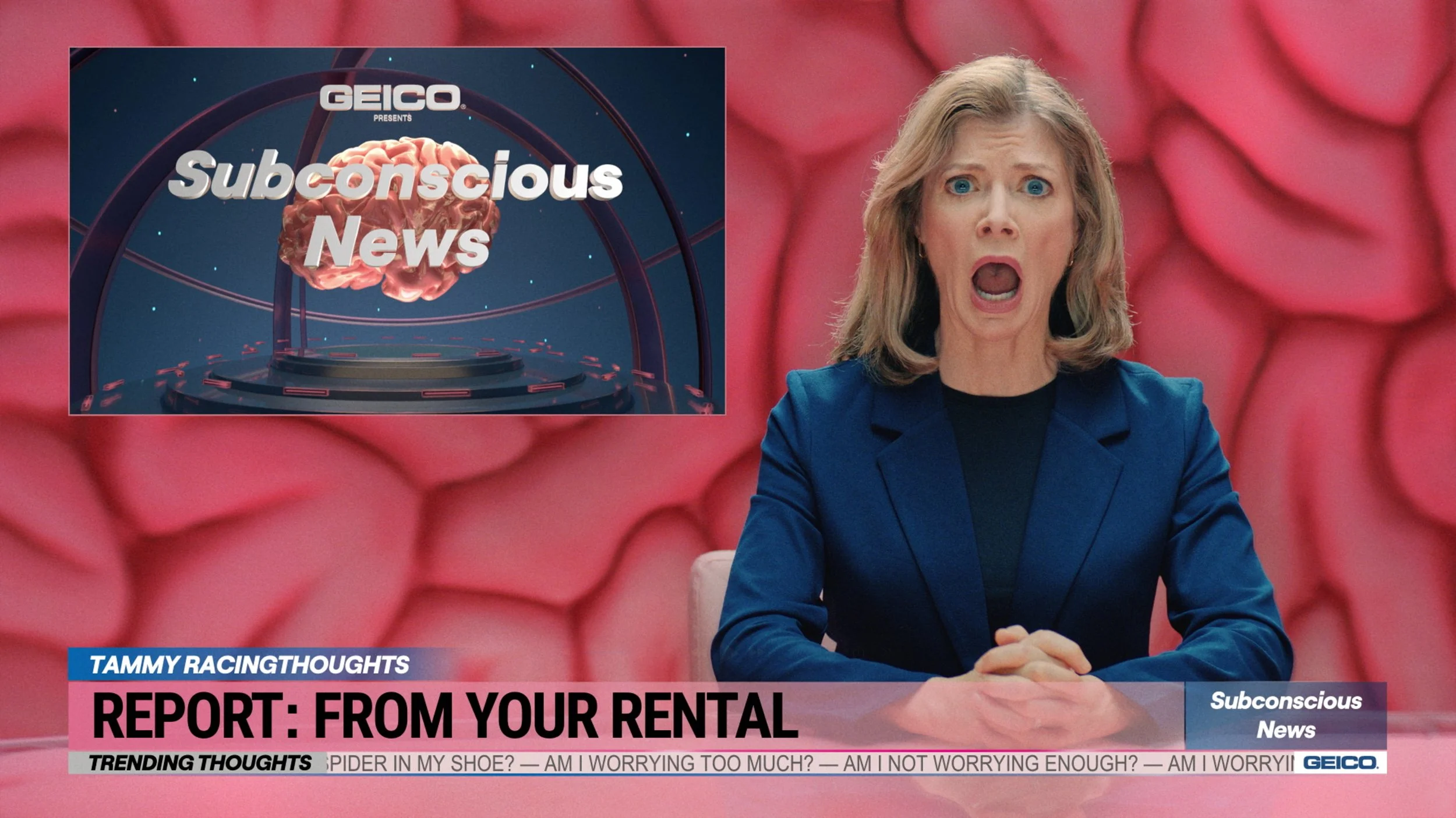 The Subconscious News Network broadcasts worries from deep within your brain. In these reports your brain is thinking about your stuff, and how renters insurance through GEICO protects all of it.